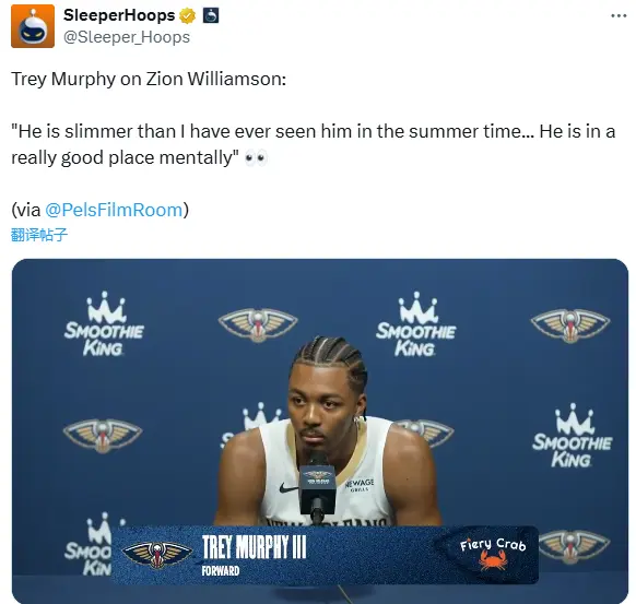 谈到队友锡安的体型,特雷-墨菲说道:他比我以往夏天见过的任何时候都要瘦,他的精神状态也非常好。