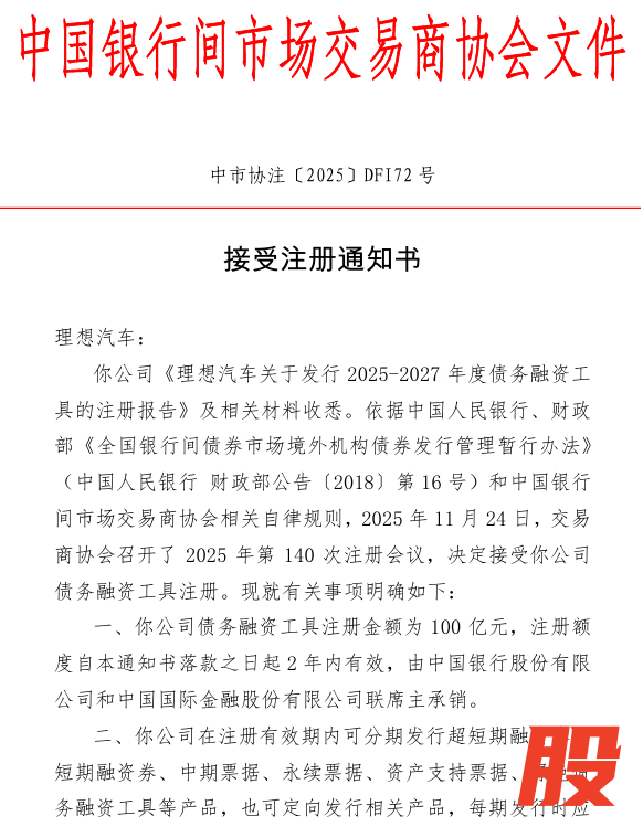 2026年1月4日,中国银行间交易商协会公告,接受理想汽车债务融资工具注册,金额为100亿元,注册额度自2025年12月3日起2年内有效,由中国银行和中金公司联席主承销。